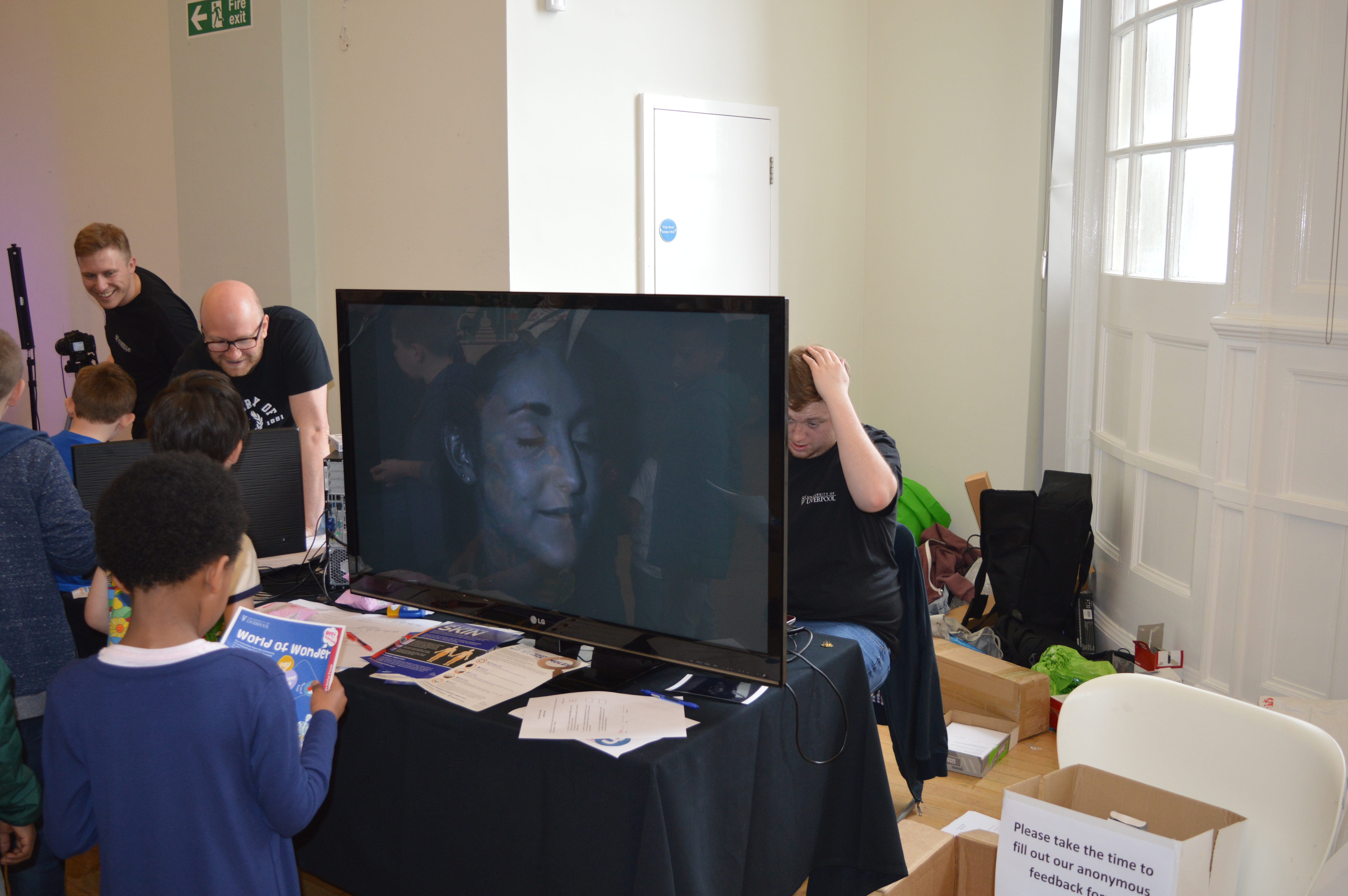 Big screen showing images from earlier in the day (and Liam looking confused)