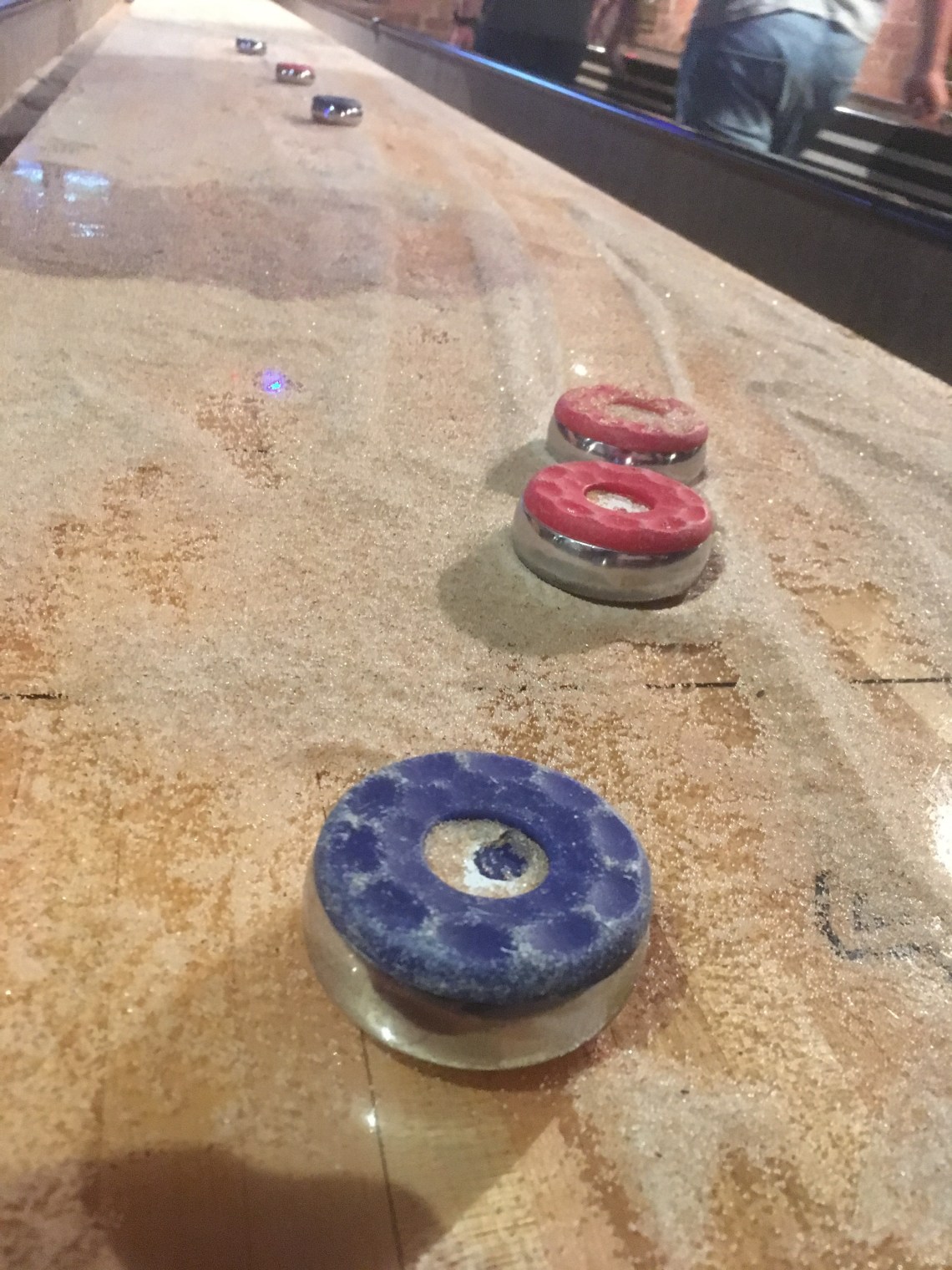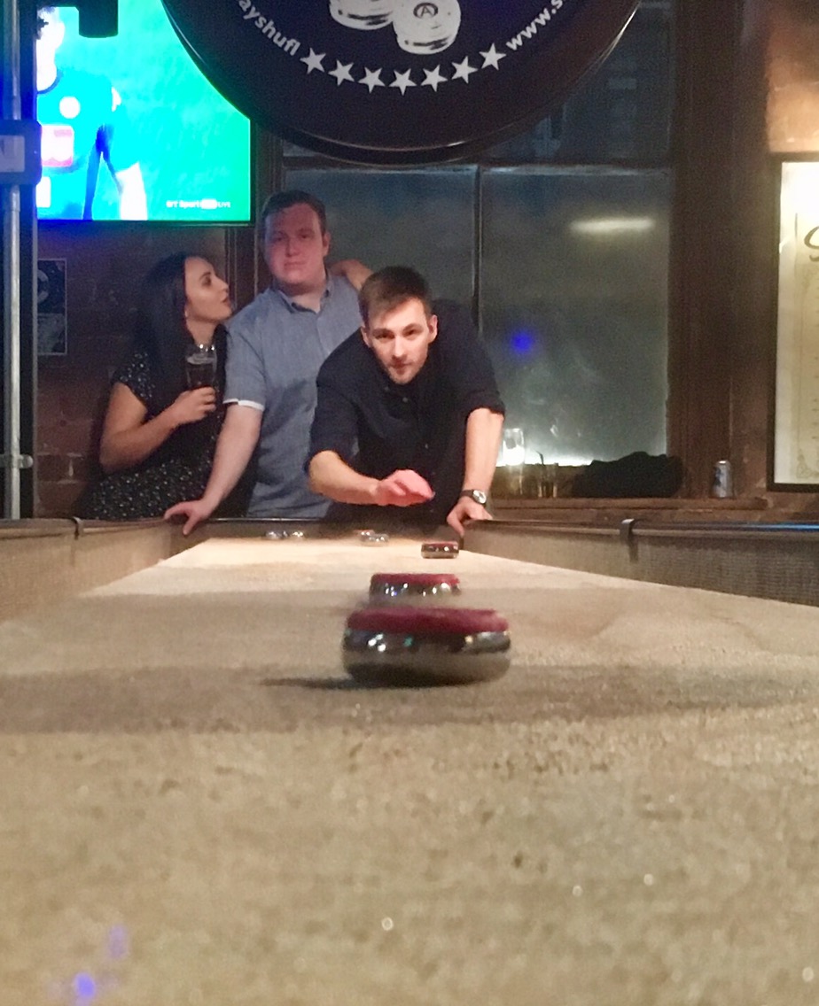 And then, the main event; Shuffleboard. On the sandiest table I’ve ever played on. Here you could tell that the presssure was beginning to get to the boys as stones were flying off in all directions. However, as a team game, Liam streaked into an early lead only for conro to pull it back so it was close going into the final ends.