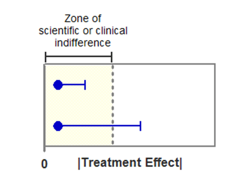 Simple method: once you have defined the equivalence zone, you can plot your treatments with their confidence intervals relative– if the 95% confidence interval falls within the range defined as equivalent then you can be 90% confident that the populations are not different (example below). If the confidence interval extends beyond that zone then you are not confident.