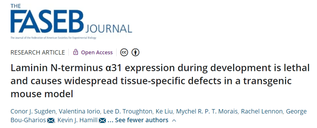 I am extremely pleased to (finally) be able to announce the publication of our most recent paper “Laminin N-terminus a31 expression during development is lethal and causes widespread tissue-specific defects in a transgenic mouse model” in FASEB Journal.