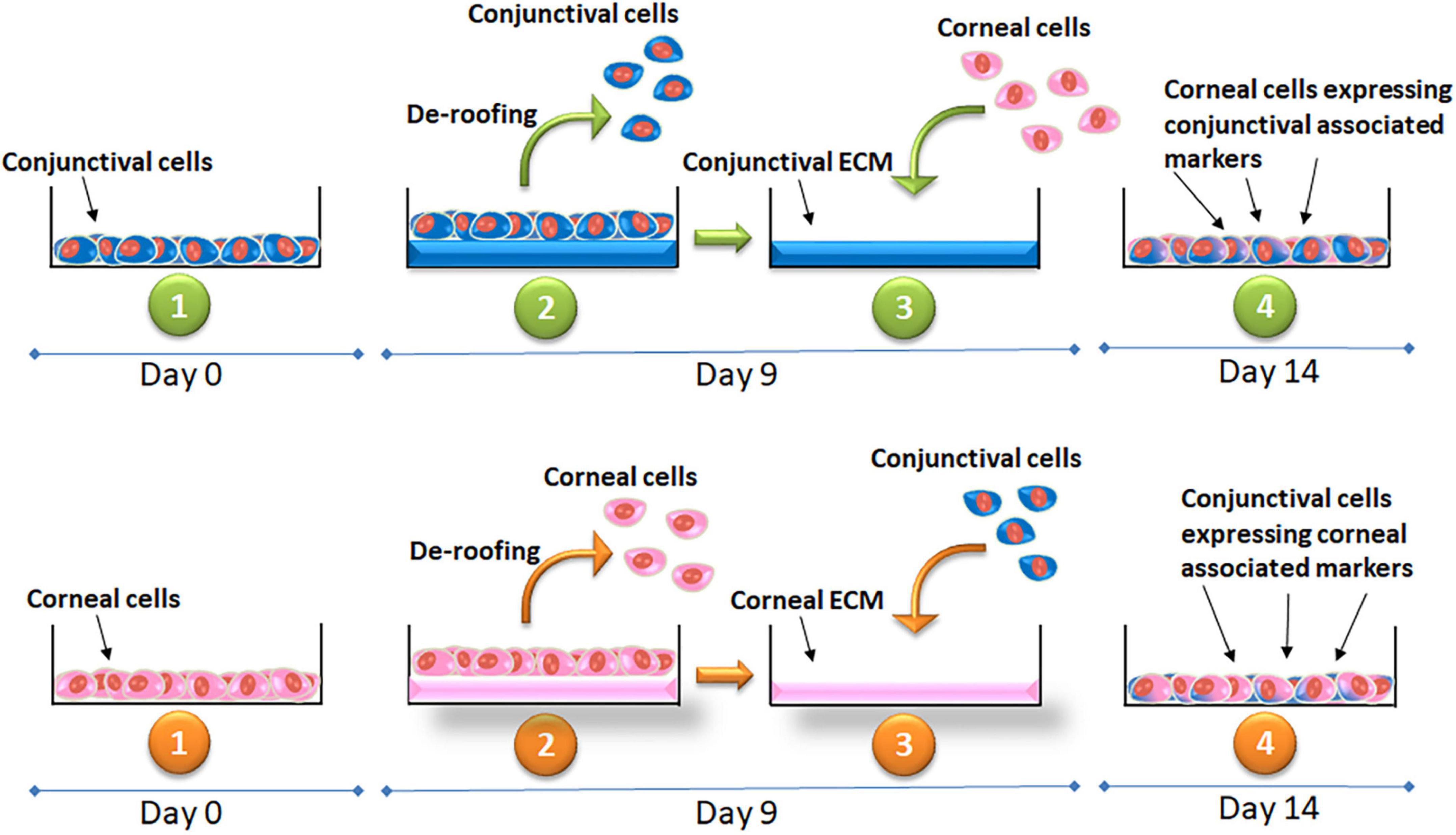 It turns out (unsurprisingly to regulars on this blog), that the extracellular matrix deposited by corneal cells provides signals that drive changes to the cells. That bit is no surprise really, what is surprising is that there is plasticity at all; that the corneal cell-derived matrix is sufficient to cause partial de-differentiation and then push the conjunctival cells partially down a corneal differentiation lineage. This same plasticity was also observed in the opposite direction corneal to conj.