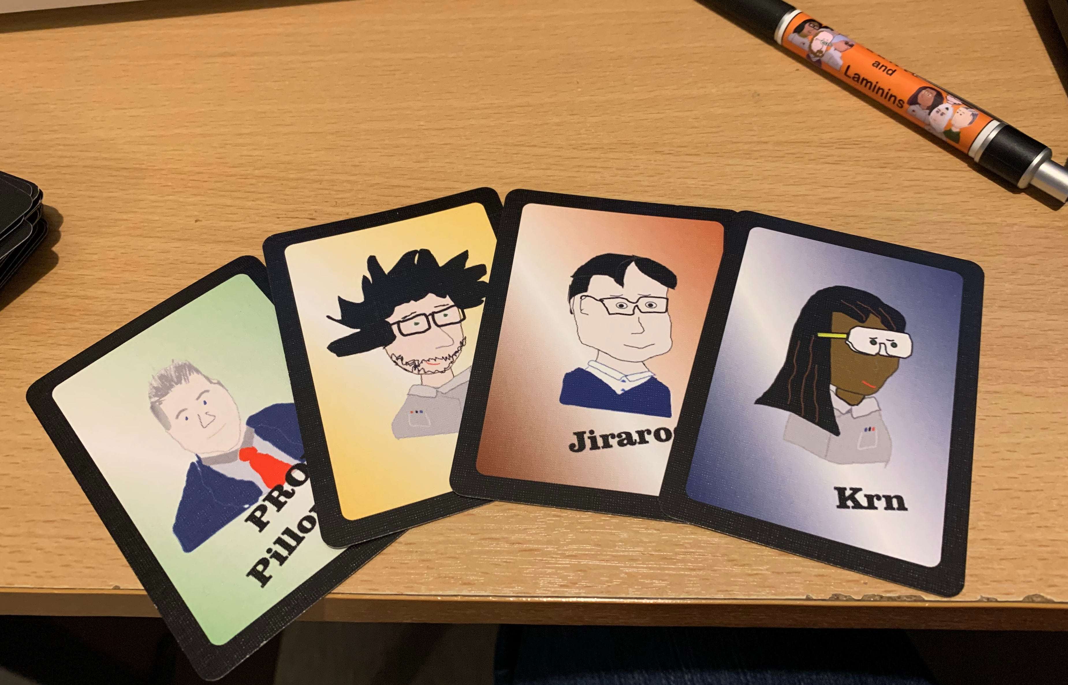 - 4 card sets can be 4 of the same coloured backs OR a “lab group” of 1 Prof, 1 yellow, 1 orange, 1 blue.
