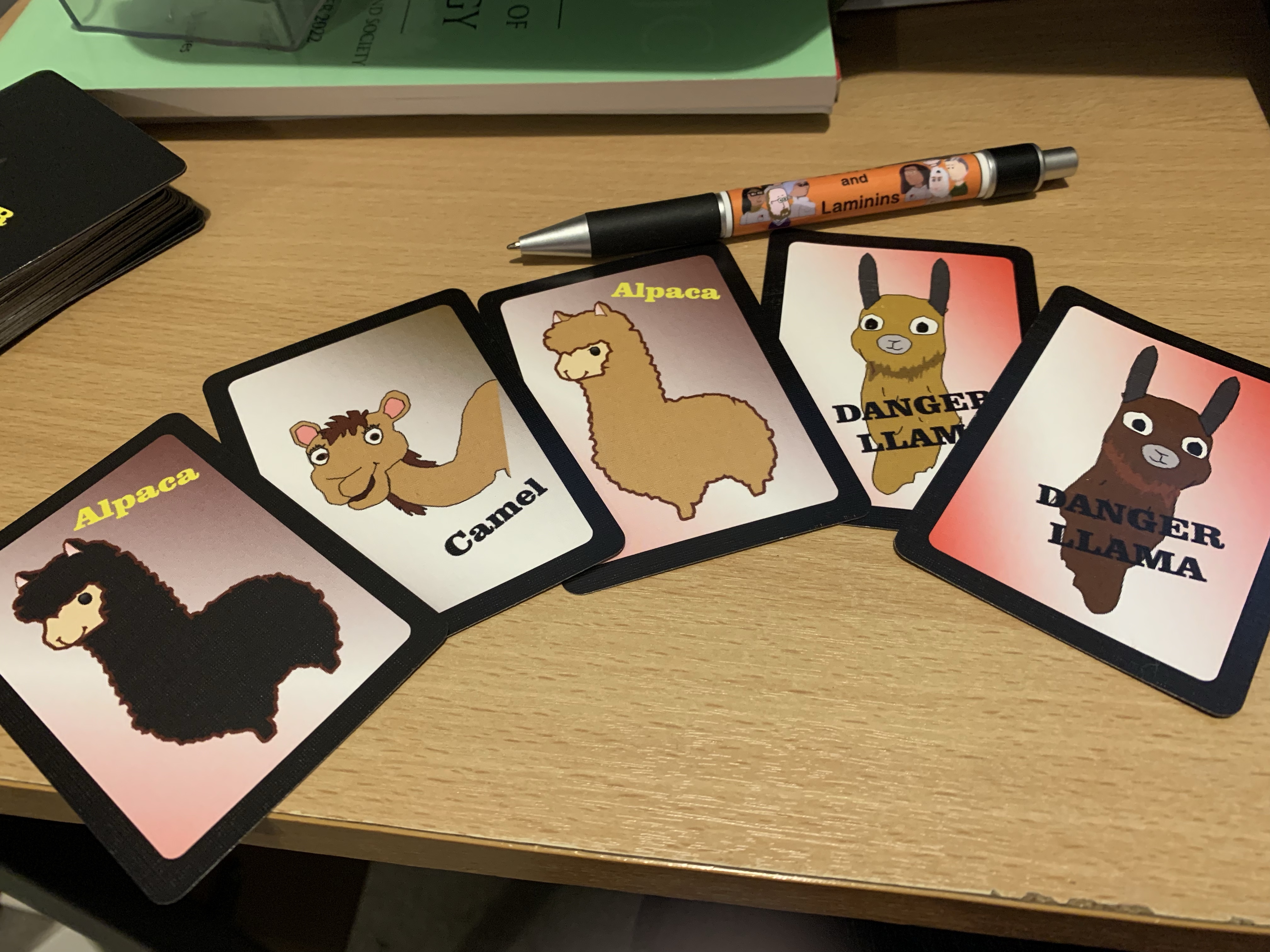 This tweak involves assigning attributes to the non-llama cards in the deck. Decide whether the special cards are in addition to the usual 4 or whether they replace one or more non-llamas. Both options can work well and will have different effects on game play. Also decide whether every player receives the same special card(s), or if it is random per game, or dealt each game round (little trickier to keep track of numbers). You can also shuffle the llama/alpaca cards into the deck so that too becomes random; however, I only recommend this when the cards are refreshed each round. Where the four player, non-random game is a tactical battle of wits, the 12 player random cards version shifts the feel of the game toward low-key entertainment (perfect for the pub).