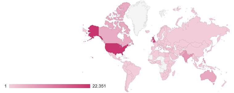 The other super cool thing is seeing the diversity of where people are coming from to access these pages: in the graph below any country with even a little bit of pink has at least one visitor.