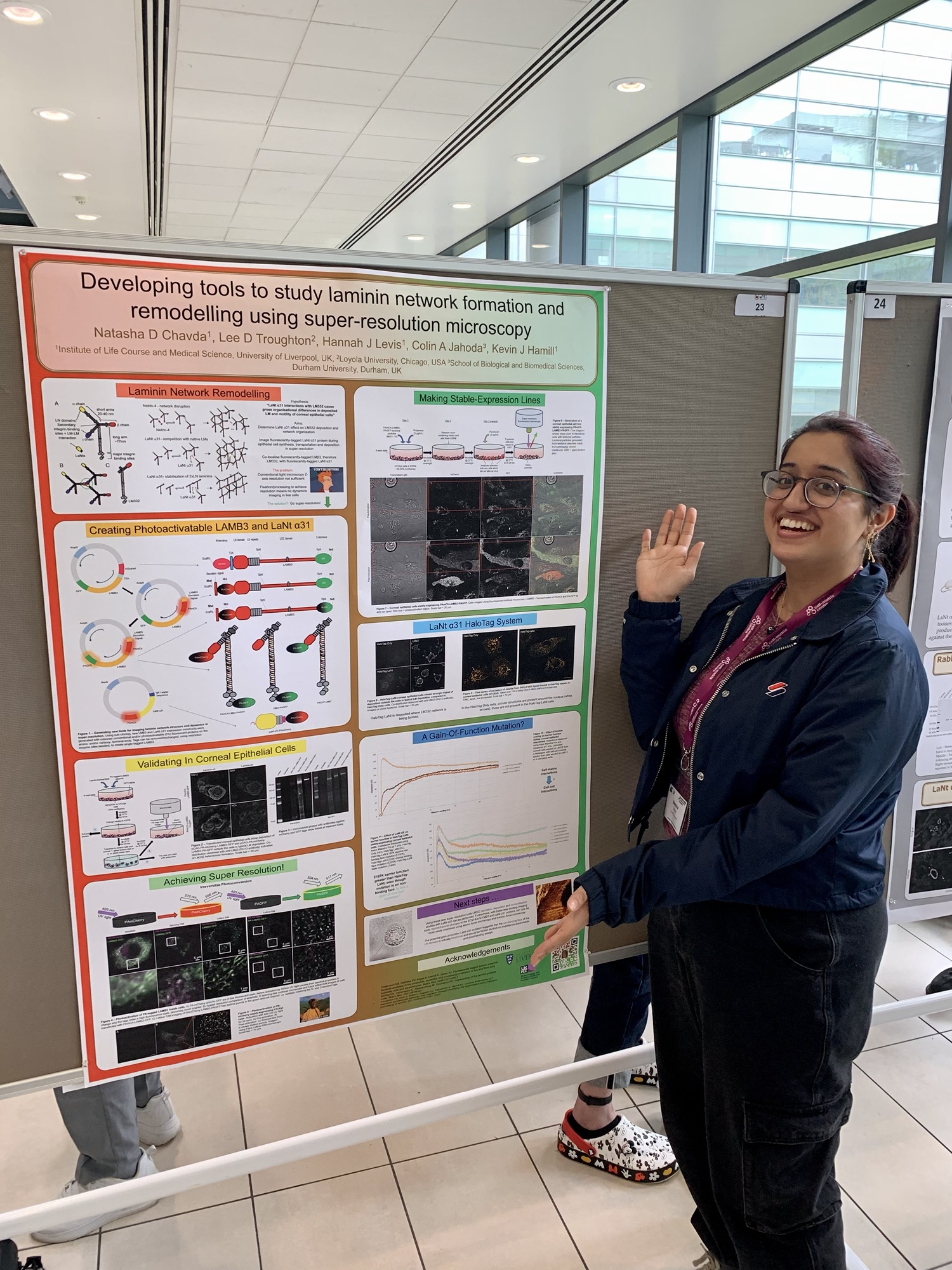 Working from Left to right: Fawziah Asiri presented some exciting new work in breast cancer invasion and metastasis with her stunning images of tumour organoids. Next, Bilge Sari presented her work on LaNt a31 in pancreatic cancer. Those images to the bottom right are super cool… she’s using the chicken eggs as a platform to grown tumours in a physiologically relevant setting but without needing animals. The results are stunning in general and the LaNt results even more so…watch this space for an update soon. Second from the right is Aeshah Hasan with her poster on LaNt a31 in the vasculature including some cool images from retinal flat mounts and some images from our transgenic model provided by Conro “Conor” Sugden (who somehow appeared in Fawziah’s picture despite now working for Prof Rachel Lennon). Finally on the far right, Natasha Chavda, looking particularly proud, was showing off her new tools for super-resolution imaging of laminins. I know what you are thinking, our resolution has been pretty super up to now, but trust me, these are super…er.