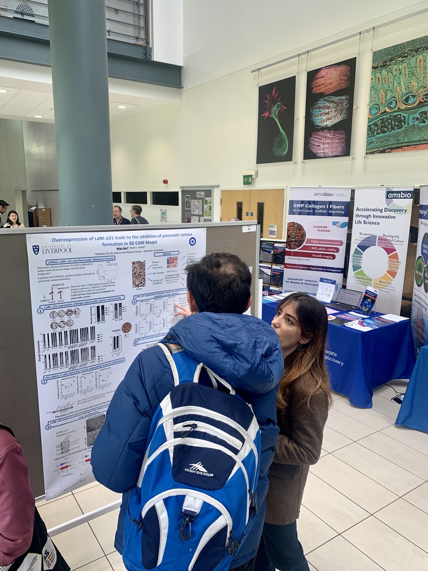 Working from Left to right: Fawziah Asiri presented some exciting new work in breast cancer invasion and metastasis with her stunning images of tumour organoids. Next, Bilge Sari presented her work on LaNt a31 in pancreatic cancer. Those images to the bottom right are super cool… she’s using the chicken eggs as a platform to grown tumours in a physiologically relevant setting but without needing animals. The results are stunning in general and the LaNt results even more so…watch this space for an update soon. Second from the right is Aeshah Hasan with her poster on LaNt a31 in the vasculature including some cool images from retinal flat mounts and some images from our transgenic model provided by Conro “Conor” Sugden (who somehow appeared in Fawziah’s picture despite now working for Prof Rachel Lennon). Finally on the far right, Natasha Chavda, looking particularly proud, was showing off her new tools for super-resolution imaging of laminins. I know what you are thinking, our resolution has been pretty super up to now, but trust me, these are super…er.