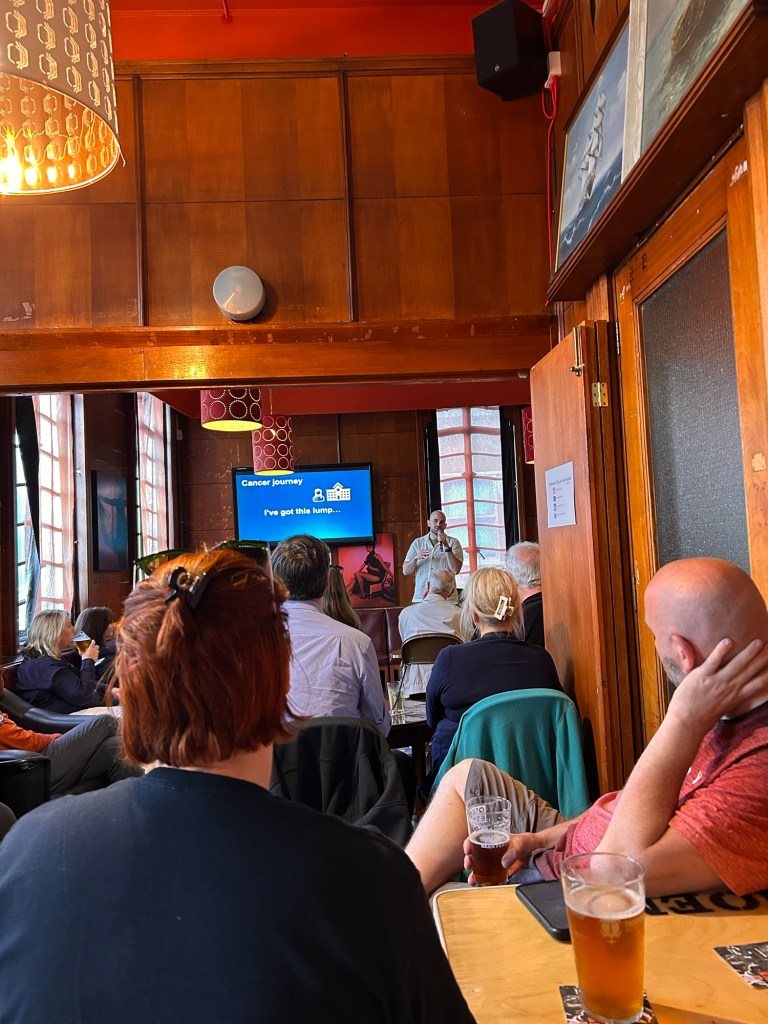 One of the most rewarding aspects of that night was not just the opportunity to share my passion for microscopy, but also to engage with a community of enthusiastic minds. Along with my own exploration of laminins, three other speakers presented on various facets of cancer research. Each talk, brimming with its own narrative and scientific insights, contributed to a mosaic of ideas that underscored how different types of research are contributing to our collective fight against complex diseases like cancer.