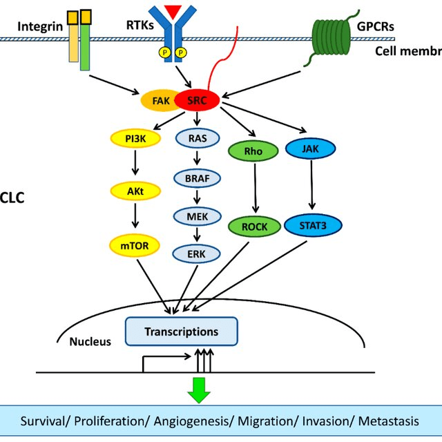 The pathways below include a lot of proteins that come up frequently – integrins, RTKs and G-protein coupled receptors (GPCRs) activate signalling cascades including PI3K (survival), Ras (proliferation), Rho (motility), at the end of these pathways is a change are transcription factors that control gene expression.