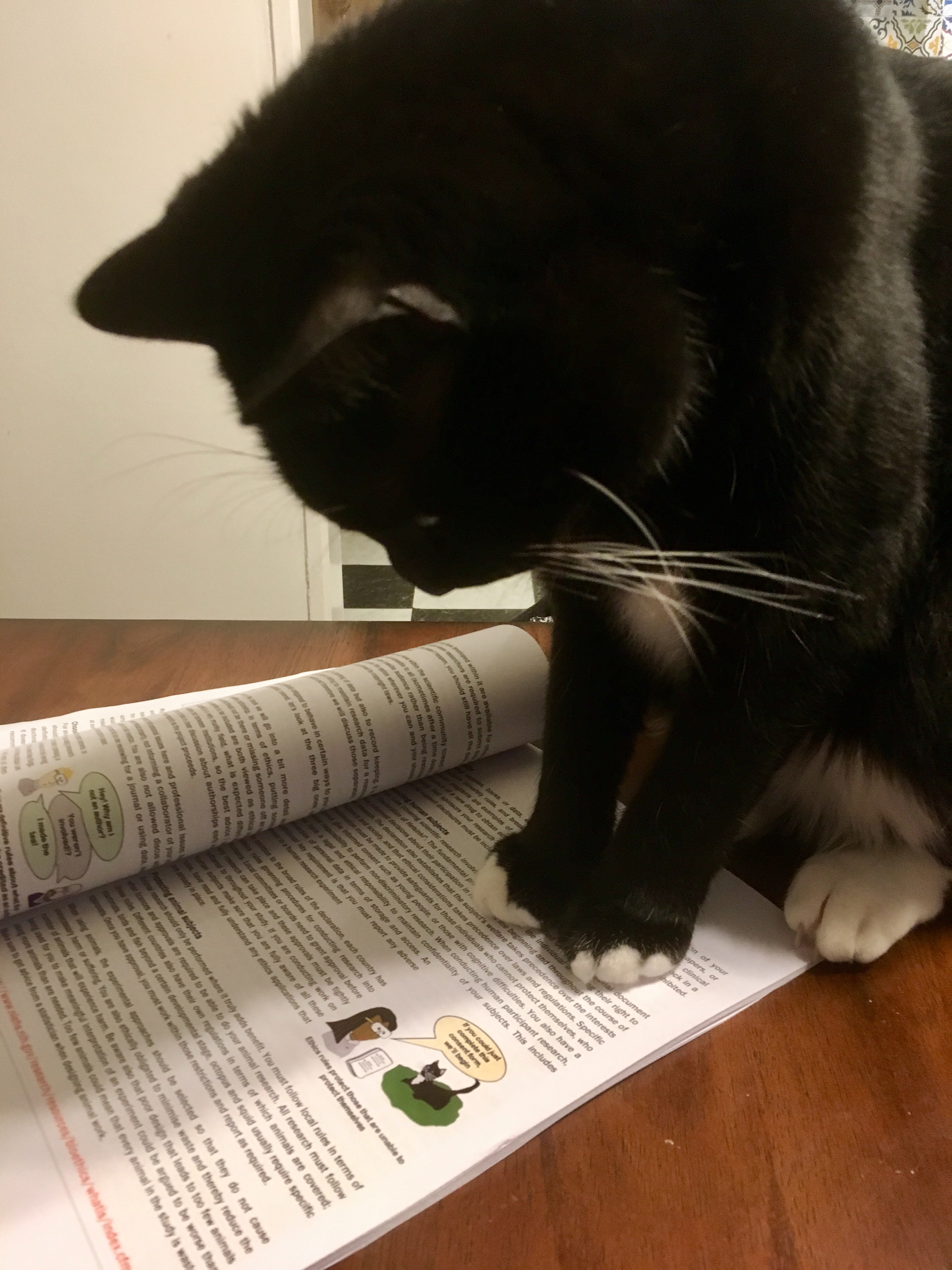 cat reading a book with a cartoon cat on it