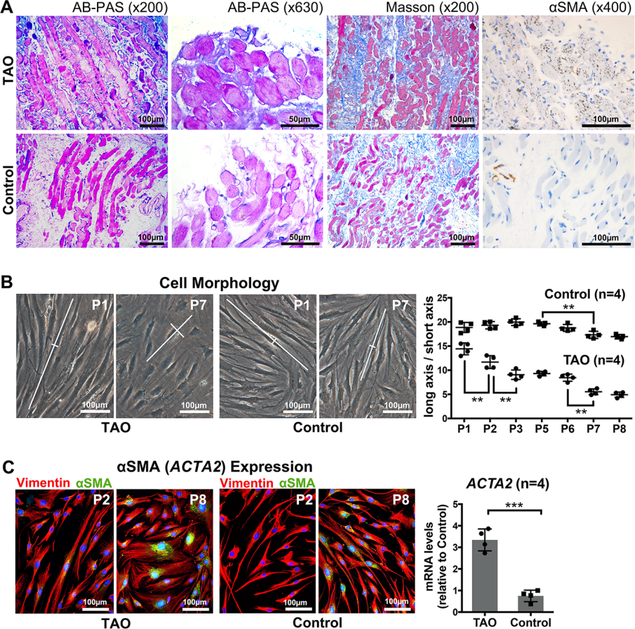 In the graph in panel C, the authors have present RT-qPCR data looking at ACTA2 (encoding aSMA) expression. The Y axis is a bit vague/confusing so we check the figure legend and it says “Quantitative PCR revealed that the TAO group expressed higher ACTA2 (encoding αSMA) than the control group (t-test, P = 0.0001).” So, we head to the methods; “Total RNA was extracted with TRIzol (Invitrogen) from TAO and control pOFs and reverse-transcribed to cDNA with a rtPCR kit…Real-time quantitative PCR was performed on a real-time PCR System (ViiA 7; Applied Biosystems, Foster City, CA, USA). Primers are shown in Supplementary Table S3. The amplification efficiency was evaluated by the standard curve method, and the mRNA level was normalized to GAPDH by the −ΔΔCT method.” Still not very clear… not exactly up to the MIQE guidelines.