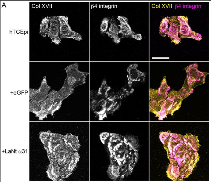 In the pic above you can see the Col XVII in the top two panels is present and in partially co distributes with the b4 integrin in the middle. However, the clustering and co-distribution is increased in the +LaNt a31 cells.