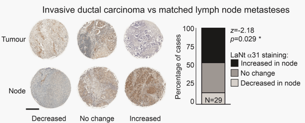 More exciting; in one third of the “triple negative” breast cancers cases there was very high LaNt a31 expression. “Triple negative” refers to absence of expression of three of the main therapeutic targets for breast cancer. This subset of tumours are often more difficult to treat and there is a pressing need to identify new drug targets. The increased LaNt a31 expression, even within only a subset of these patients, might be something we can exploit in the future as a target for new drugs.