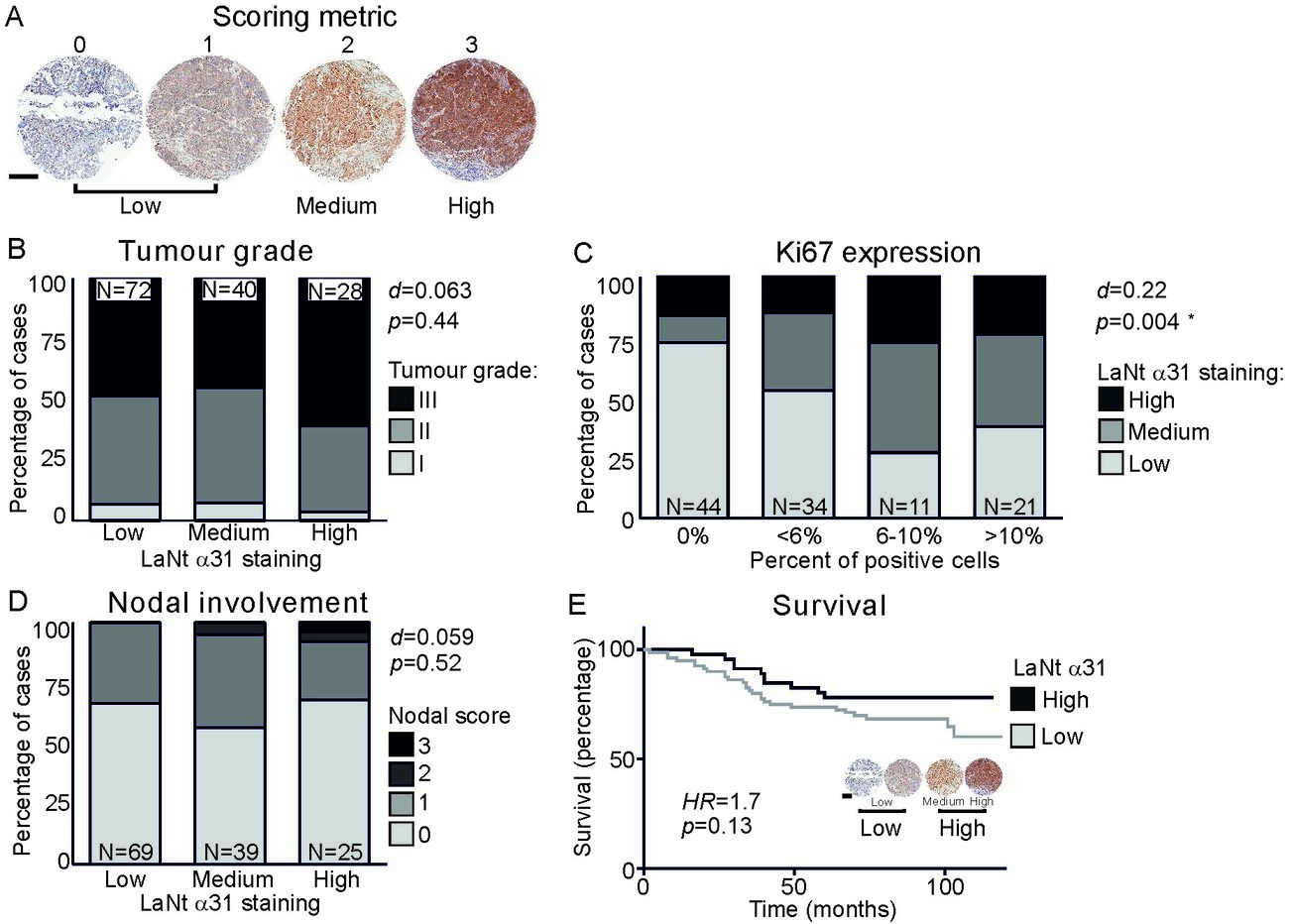 This analysis was actually a little disappointing (and surprising). It revealed that there actually wasn’t a strong association between tumour grade (how “bad” a tumour looks) and LaNt a31 staining intensity (B below) or LaNt expression and the presence of nodal involvement (D below). However, we did see that the highly proliferative tumours were likely to have high LaNt a31 staining (C below, Ki67 is a proliferation marker).