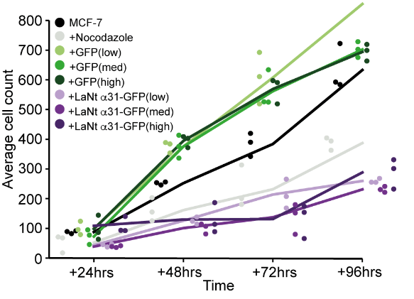 First we asked what effect does increased LaNt a31 expression have upon cell proliferation. We observed that the cells expressing the LaNt construct (purple) proliferated at a reduced rate compared with the control treated cells (green, black). This was a little surprising – our tissue staining suggested that it would be the opposite way around (don’t you just love science!). We also tried some extra experiments in an attempt to work out if expression goes the other way around i.e. if high proliferation drives higher LaNt expression. Those data said proliferation is not required but the jury is out whether its a driver… watch this space.