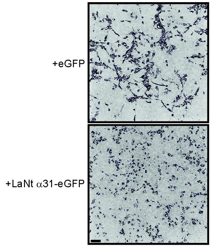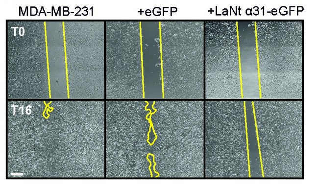 Normally, MDA-MB-231 invasive cells invade as strings of cells, follow my leader style “multicellular streaming”. In the LaNt a31 expressing cells this changed to a different form of invasion, with each individual cell apparently acquiring the ability to invade. Extremely interesting! But there’s more. That change in invasion “style” was only observed when the cells were migrating into a laminin containing matrix and not when the identical assay was performed when migrating into collagen. Remember how I said earlier that LaNt a31 is laminin-related and we hypothesised it would work on laminins…