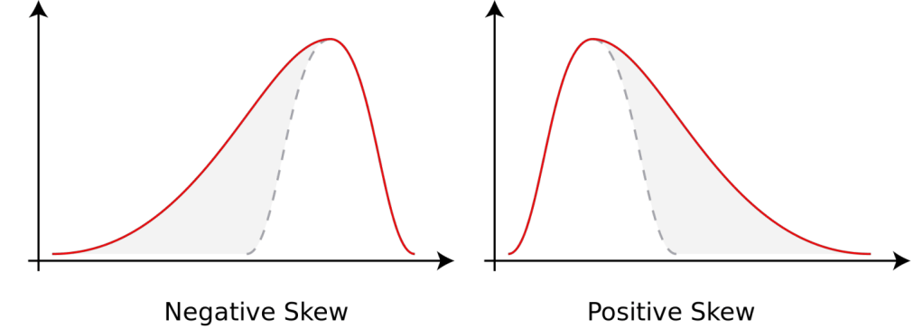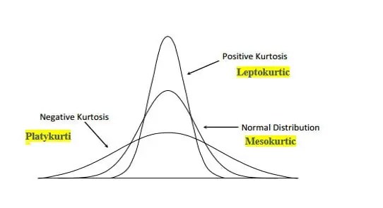 Before we move on entirely, let’s look at the other aspect of distribution that can mean even a symmetrical distribution isn’t “normal”… kurtosis. Diagram belwow shows the types of kurtosis you might observe. Note that a perfectly normal distribution has a kurtosis value of three, so less than three is negative, above three is positive.