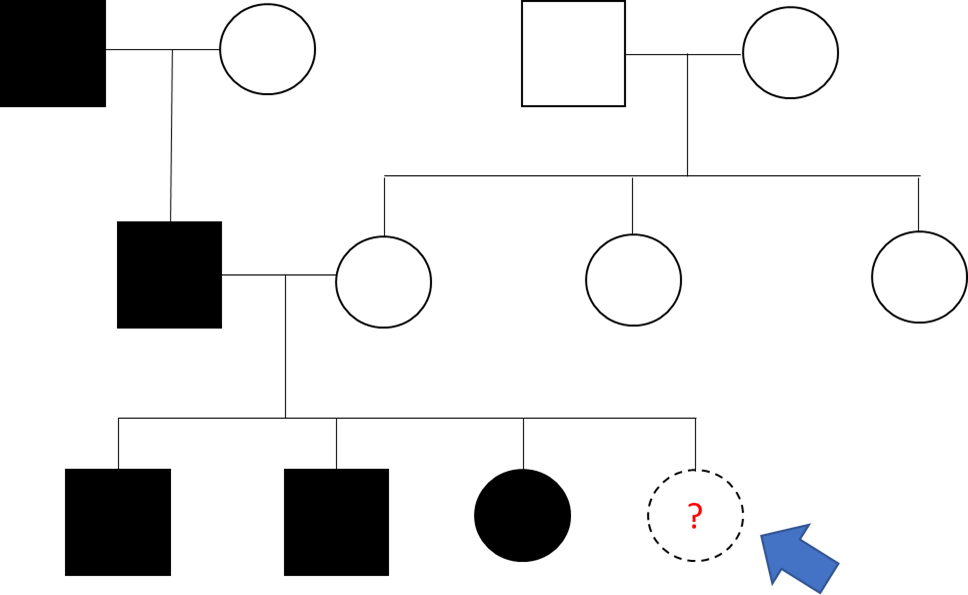 In this pedigree, you are counselling the family about their pregnancy. What is the probability that the next child (indicated by the arrow) will develop the condition?
