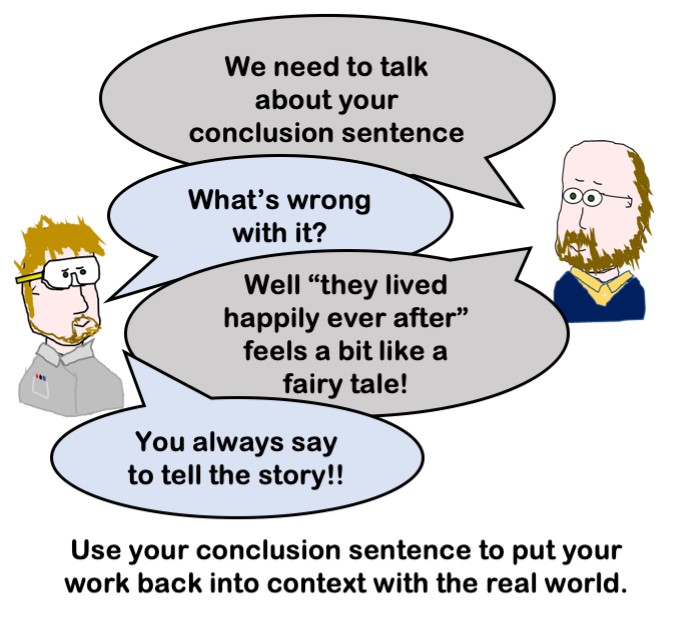 DON’T FORGET THIS. A single sentence wrap to put your work back into a real world context. Make your conclusions a as general as your data can support while making sure it doesn’t an overreach. As noted above, your last line of your conclusion should go back to the same width as your opening sentence. Your conclusion should also agree with your title and the conclusions section of your discussion. Use different phrasing in the two sections but keep the same message.